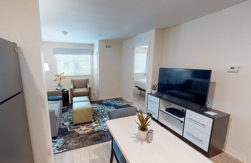 Experience the ultimate in hospitality. WaterWalk is conveniently located in Morrisville, NC, tucked in a residential setting off Chapel Hill Road with easy access to I-40 and NC-540. We are only a short drive to Research Triangle Park and Raleigh Durham International Airport (RDU). We are minutes away from beautiful outdoor experiences such as, RDU Observation Park, Lake Crabtree County Park, Cedar Fork District Park or experience new heights at Triangle Rock Club. We have multiple shopping, entertainment, and dining options close by. Our all-inclusive 1-Bedroom 1-Bath apartment style suite will make you feel at home – complete with expansive living spaces, private bedrooms, chef’s kitchen with full-sized appliances and in-unit washer and dryer. All you need to do is unpack your suitcase, kick back and enjoy yourself with a cup of java in our spacious lobby or get cozy at our Community Courtyard fire-pit and outdoor grills or get in a workout in our fitness center.