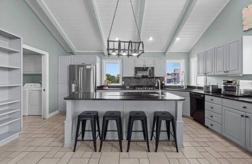 The main level is also home to a gourmet kitchen with a large center island, marble countertops, and prep sink with updated appliances, a Ninja coffee maker, two (2) ovens, and a gas stovetop, making this the perfect place to whip up a meal that will satisfy your entire party. Just off the kitchen is a laundry area with washer and dryer, a large walk-in pantry with plenty of storage space, and additional work space with a second monitor. The kitchen spans out into a dining area that seats 8 as well as a full size bar with a sink, marble countertops, additional full-size refrigerator, and wine cooler where you and your guests can reflect on the day with beverage in hand. Down the hall is a full-size Queen Bedroom with access to the hallway bathroom and a King Master Bedroom that hosts a private bathroom with tiled shower stall and jetted tub, a 55” 4K HD Smart TV for catching up on your favorite shows, and sliding glass doors that lead to the furnished deck with gorgeous waterfront views.