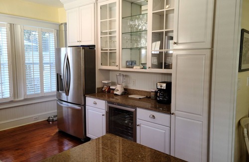At the house, you can unwind on the front porch and watch the world go by or enjoy the quiet privacy of dining on the back patio. Comfortably sleeps six in three bedrooms. Two bedrooms are on the first floor and one bedroom is upstairs. The upstairs bedroom is a bonus room that has twin beds, sofa, TV, and full bath, making it a great place for kids to have their own space. Up to two dogs are welcome and there is a fenced in backyard for them to have their own space too. When staying in Beaufort, your best choice is Captain’s Choice!