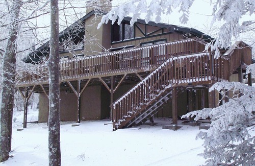 Wake up to brilliant fall colors and sweeping mountain views from the large deck of our slope-side chalet. After a day of hiking or leaf peeping, unwind in the spa-like master bath or gather by the cozy stone fireplace with ample seating and a 65" TV