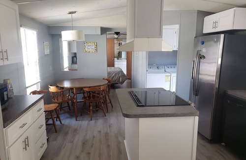The open kitchen is equipped with all of your needed appliances, along with plates, silverware, pots and pans, and a crock pot. There is a round table in the kitchen with 4 chairs and a place for 2 to sit on the side bar off of the kitchen. There is a high top outdoor table just off of the back deck with 4 high top chairs. You can prepare your meals in the kitchen or on the deck below!