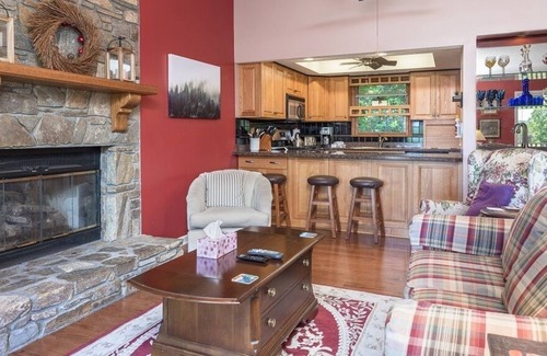 Indulge in a mountain vacation at this spacious three-bedroom condo overlooking Apple Valley Golf Course. With tasteful furnishings and stunning views, this unit is perfect for families or golf groups. The main floor features a master bedroom with a king bed and private bath, as well as a second bedroom with a queen bed and two twin beds. A spiral staircase leads to a unique media room with a home theater system and a pull-out sofa bed. The third bedroom has a queen bed and private bathroom. The condo offers WiFi, a DVD player, modern kitchen, gas fireplaces, and more.