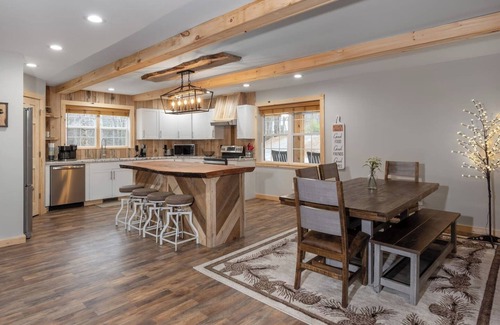 *️⃣ Fully Equipped Kitchen: Stainless steel appliances, double ovens, Keurig K-Cup coffee maker, butcher-block island with 4 bar stools, and a rustic dining table seating 8.
