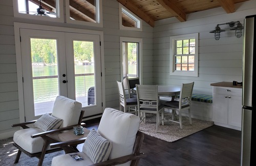 This unique home has a style of its own with beautiful views of the mountain and the lake. It's a brand new house with a boat house. The boat house is on Lake Lanier it has a living room, kitchen table, refrigerator and seating outside above the water. It has a dock with 2 paddle boards and 2-2 person kayaks. Come enjoy the lake swimming, kayaking, paddle boarding or try your luck fishing. Town of Tryon is only 2 miles away with wonderful shops, coffee and restaurants.