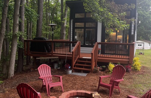 This cottage was inspired by Cape Cod and was first built in 2021 and just had everything upgraded! It features a 15ft vaulted wood ceiling, granite countertops, marble floor in the bathroom with a rainfall shower and a wrap around deck with fire pit.