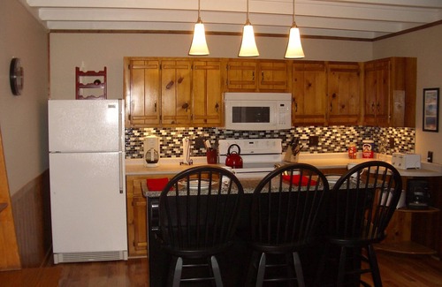 The cabin has an open floor plan for kitchen, living and dining area. Accommodations include a Master Loft with king size bed and full bathroom and second bedroom on the main level with full bathroom that can be closed off for "on suit" convenience. A Cabin on Paradise sleeps 4. With a well equipped kitchen, wrap around porch with screened in porch overlooking the river and a gas burning fireplace for quiet evenings.