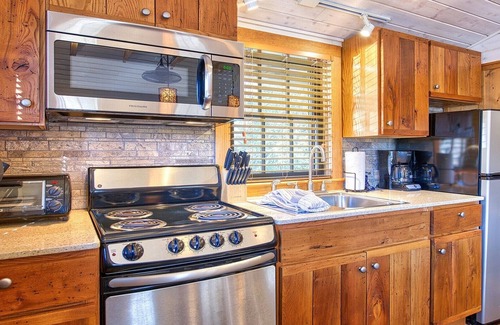 Carruth Cottage is a recently remodeled studio apartment quietly nestled among the trees in a charming neighborhood. You will enjoy the privacy Carruth Cottage offers as it sits on its own, perched over the original natural stone garage. Although Carruth Cottage is a studio, you will find it surprisingly spacious with a roomy new full bathroom, a queen size bed, and a full-size pullout providing enough room for everyone. The attractive new kitchen cabinets are made of reclaimed wormy chestnut giving the home a warm feel while the ample counter space, well stocked utensils, cookware and dishware keep even the fussiest cooks happy. This lovely cottage offers cozy comfort and mountain charm without sacrificing modern conveniences. Enjoy dinner outside on the patio table complete with a shade umbrella. After a busy day of sight-seeing or attending a local conference, the deck is the perfect place to relax and unwind in the peaceful surroundings and under the large bank of shade trees. Imagine sitting outside in the early morning sipping your coffee and basking in the serenity. Carruth Cottage is a premium vacation rental studio home that offers relaxation and comfort, a beautiful wooded peaceful neighborhood, central heat/AC, cable HD TV, WiFi, paved roads, and year round access.