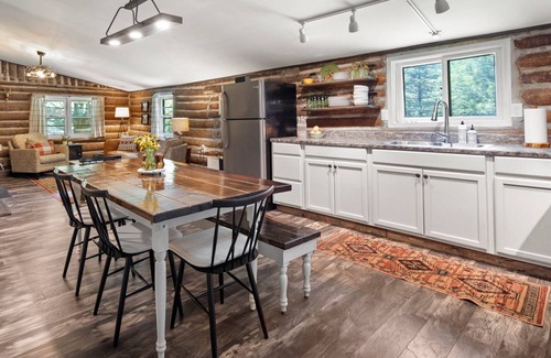 Start your mornings sipping coffee on the front porch—yep, we’ve got rocking chairs and a bench with your name on it. Inside, it’s all wood beams, comfy vibes, and that perfect cabin smell. The kitchen’s got everything you need to whip up pancakes or pour a glass of wine and just chill. Gather around the big farmhouse table for meals, board games, or late-night chats.