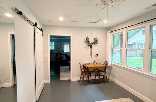 Private bedroom with queen bed plus couch that doubles as a full size bed. Open floor plan with cozy living space, full kitchen, and cute dining area.