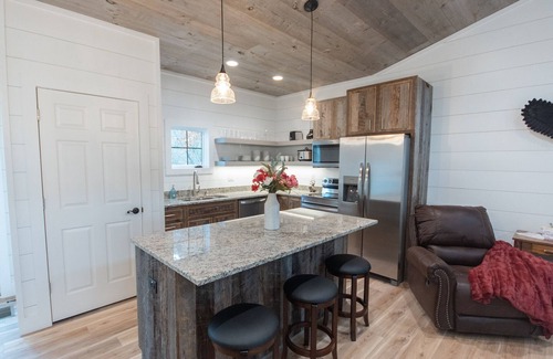 Creek front, brand new, cozy, mountain cabin, located in the Great Smokey Mountains, Franklin, NC. "Water's Edge" borders Wayah Creek. The house is surrounded by majestic mountains, and a wide, rushing creek. The two queens beds accommodate four comfortably; a sleeper sofa is in the den. The creek is stocked with rainbow trout. The inside is a mixture of modern and rustic architecture, in a peaceful, relaxing setting. We have a brand, new treehouse beside Water's Edge if you're interested in booking with Family or friends.