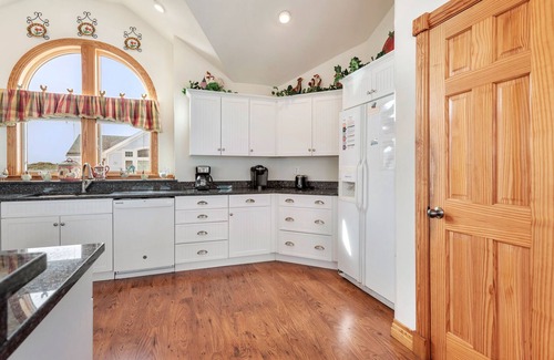 The main living area on the top level features vaulted ceilings, oversized picture windows for plenty of natural light, and kid-friendly wood flooring throughout. Comfortably furnished, there's plenty of seating for watching movies or curling up with a book by the gas fireplace. The open-concept layout allows guests to work in the kitchen while still being part of the action, and everyone can enjoy meals together at the large dining table for 12, plus bar seating for 4 more. You can also serve dinner or drinks outside on the deck overlooking the pool. Use the elevator from the ground level to make unpacking luggage and bringing in groceries a breeze. Host poker night in the Ships Watch, which offers a slight view of the sound for spectacular sunsets. Or shoot pool downstairs in the rec room, featuring a wet bar and additional full-size refrigerator that can be easily accessed from the pool area. Sure to be the most popular area of the home, this outdoor oasis features a large private pool and hot tub, plus a grilling area and enclosed outside shower. The pool can be heated during certain times of the year, ideal for off-season getaways. After a long day of fun in the sun, retreat to one of the six master suites for some privacy and quiet time.