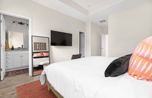 - Spacious Master Bedroom showcasing a king-sized memory foam mattress, an ensuite bath boasting a two-sink vanity, a shower, and two walk-in closets.