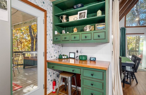 Our spacious A-frame, originally built in the mid-1970s and lovingly renovated in 2021, features a gourmet kitchen that any home chef will adore. With custom inset green cabinets, an induction range, and a quiet Bosch dishwasher, you’ll find everything you need to whip up family meals. We even provide many staples like flour, sugar, and spices, so be sure to check before your grocery run!