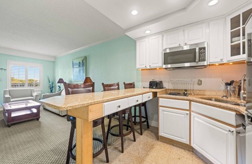 Sunset Surf features 1-bedroom with a King bed and a Queen sleeper sofa in the living room. It can comfortably sleep up to four guests. The living area has a TV, ready for those movie nights after a long day at the beach. The kitchen has everything needed to cook a delicious meal, providing that home-away-from-home feel. This unit is located on the first level, facing the pool.
