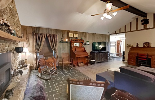 Experience rural bliss at this 6BR/3BA retreat! Comprised of two homes, Higher Ground and Cornerstone, you’ll enjoy quiet privacy on a sprawling lot with long-range pasture and mountain views. The homes are each beautifully updated with new furnishings and sleek kitchens. A well-appointed game room and smart TVs in each bedroom provide evening entertainment. Stroll on soft grass in the expansive yards and admire the near-endless mountain views. Choose from a plethora of nearby outdoor activities. Spend summer days at Lake Junaluska. Venture into downtown Asheville to explore the local culture. HIGHER GROUND Higher Ground sleeps eight guests between three bedrooms, two queen sleeper sofas, and a twin-over-twin bunk bed in the game room. Each bedroom has a smart TV. Stream new movies on the smart TV in the main living area. The second living area is outfitted with a sleeper sofa and a smart TV. Play pool, ping-pong, and foosball in the game room, furnished with a sleeper sofa and a twin-over-twin bunk bed. Home chefs will be delighted to find new stainless steel appliances in the kitchen. The kitchen bar and the breakfast table each seat four. Share meals around the table for six in the dining area. Sleep soundly on a king bed in the primary suite. The en-suite bathroom is configured with a tub/shower combination. The second and third bedrooms each hold a full-size bed. The guest bedroom bathroom offers a tub/shower combination. Gather in the shade on the covered patio and barbecue tasty meals on the charcoal grill. The table seats eight to alfresco meals, and the bar seats two. On clear nights, kick back around the wood-burning firepit. CORNERSTONE Cornerstone sleeps six guests in three bedrooms, each equipped with a smart TV. Settle in on the seciontal in the living area and stream favorite shows on the smart TV. Sip morning coffee and take delight in the breathtaking views on offer from the sunroom, featuring a sofa and an armchair. The sleek kitchen is equipped with a host of helpful gadgets. Gather for tasty meals at the six-person dining table. The first and second bedrooms each have a queen bed. The third bedroom is outfitted with a full-over-full bunk bed. The bathroom is configured with a tub/shower combination. Enjoy expansive mountain vistas on the back deck. In the evening, dine at the picnic table. EXTRA PERKS & MORE DETAILS Extra perks include complimentary Wi-Fi and a washer/dryer in each home. Parking is available for five cars between two driveways. Street parking is not permitted. The fireplaces are not operational. Higher Ground is two stories and accessed via one exterior step. Cornerstone is one story and has step-free access from the driveway. The exterior of each home is equipped with security cameras. THE TURNKEY PROMISE With TurnKey, you’ll always find unique vacation rental properties that provide a consistent, fine-hotel experience – Every Home. Every Stay. Every Time. Access to your professionally cleaned, sanitized home is convenient. All properties have on-site devices for your security – these may include security alarms, decibel monitoring (which do not record voices), and exterior motion sensors or cameras. If you need anything before, during, or after your stay, our 24/7 local team is ready to help!