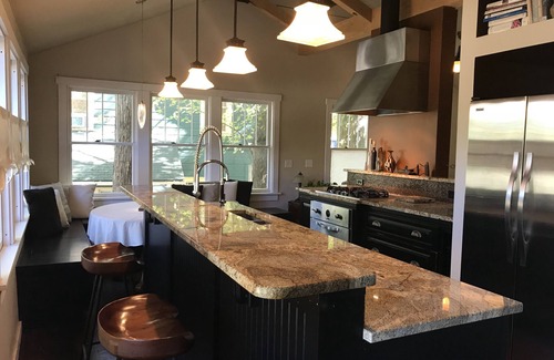 Vaulted ceilings with industrial exposed metal ductwork and exposed oak beams. Modern loft living very close to downtown! Viking appliances and granite countertops in the large, open, fully equipped kitchen. Travertine tile walk-in shower, and Duravit soaking tub in the master bedroom.