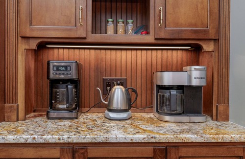Kitchen: Fully stocked and family-ready with two center islands, sinks, coffee maker, and bar seating for 7.