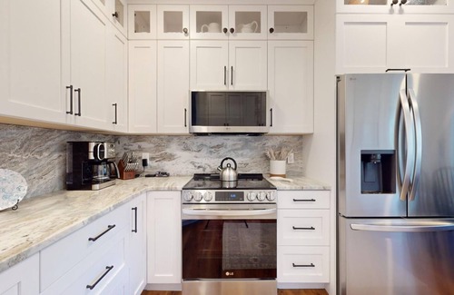 On the upper level, you'll find two large bedrooms, one with a Queen bed and the other with a King bed. There is also a full hallway bath for guests to share.