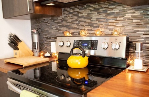 Socialize on the two-story deck (winter sunset views from the upper level) or nap on the hammock in the private, fenced backyard under a plush canopy of trees and bamboo. Finish the day relaxing in the bathroom's oversized tub with a teak-wood tub deck.