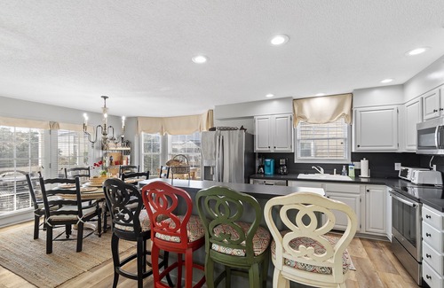 The main floor presents an open living area with large screen TV and large sectional sofa with room for the entire family. This room transitions into the adjoining kitchen/dining area. The kitchen has all the appliances and cooking utensils you may need as well as a Keurig Duo Coffee maker, traditional coffee maker, blender and toaster oven. The dining table sits six with additional seating at the bar.