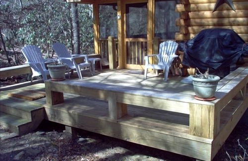The cabin sits on a wooded lot overlooking a mountain stream with multiple waterfalls,in season, providing beautiful music and comfort from the 10 foot by 36 foot screened porch. The cabin has a gourmet kitchen with granite counters, stove, microwave, dishwasher and double door refrigerator. There is an eating bar separating the kitchen from the dining room, and a large living/dining great room with rock fireplace. The fireplace has gas logs. Master bedroom is 20 X 16 has private bath and large walk in closet, second bedroom is also large with ample wall of closets and next to second full bath. Each bedroom has a queen bed and is beautifully decorated with complete linens. The kitchen has cooking supplies and utensils. The cabin has a washer and dryer to make a vacation stay as comfortable as possible. Cable TV is also provided in both the great room and the master bedroom, each with DVD player as well. The screened porch also has a fouton for sleeping. There is Wi-Fi in the cabin as well.