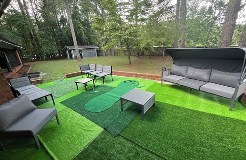 Escape to this charming house in picturesque Fayetteville. With 4 bedrooms including 1 king bed, 3 queen beds, and 2 sets of bunk bed, this awesome property is perfect for families or groups of friends. Enjoy the fitness room, movie theater, poker &bar lounge, game room and an comfortable heated and cooled space during your stay. The 3 bathrooms feature showers for your convenience , and outside boasts a puttputt patio. We hope you enjoy what our place and Fayetteville has to offer.