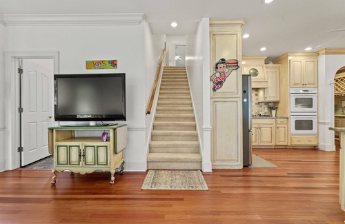 This home is like no other! Located up on a hill in a nice, quiet neighborhood. Not only is it incredibly spacious and comfortable, it has fun and nostalgic decor throughout! Can you guess the famous actor in the foyer portrait? There are two clues nearby should you need them. Fun themes in each room. Full game room includes pool table, board games, large screen TV and TWO Retro video stand-up arcades with over 60 old school games! Family Room includes large Roku TV and plenty of interesting books for those avid readers. Three dining spaces, lots of places to relax. Oversized kitchen includes double oven, French door stainless steel refrigerator, microwave, dishwasher and two sinks and is fully stocked for any kind of meal prep. Sleeping is a dream with spacious bedrooms and walk-in closets. The main bedroom is oversized with a King bed and memory foam topper on the first floor and its oversized private bath is fully handicap accessible with grab bars throughout and a jacuzzi tub! The other 4 bedrooms are upstairs: 3 Kings and 1 Twin bedroom containing two Twin sized beds. All with memory foam toppers and ceiling fans. (1) King bedroom shares a large Jack-n-Jill style bathroom with the Twin room and the other two King-sized bedrooms have their own private full bathrooms. Very peaceful screen porch is another dining space option or a great space for your morning coffee.