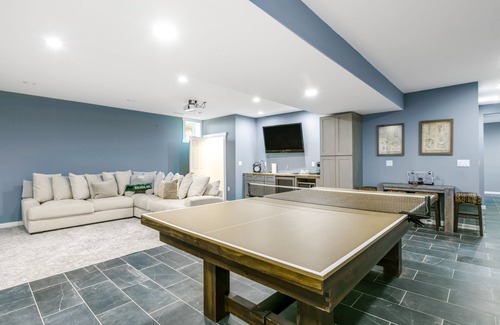 For your evening entertainment, gather by the gas fireplace in the living room to stream movies via an Amazon Fire TV Stick, or head downstairs to the rec room to find a Ping-Pong/pool table, a wet bar, a TV, and a movie projector with Roku. Three bedrooms have en suite bathrooms, and one has a custom bunk room with an arcade console and an adjoining yoga space. Other notable features of the house include a laundry room, central air-conditioning, and natural spring-fed water.