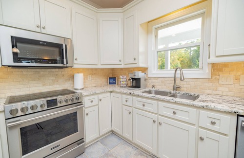 Open floorplan with family room, gas fireplace, kitchen with granite countertop, 4 counter stools and 6-person dining set. Ceramic tile and LVP floors throughout main level. Half bath and laundry room. Stunning airconditioned sunroom with breathtaking views of the lake with 6-person dining set and 5-person sofa set. Master bedroom (king bed) and on suite bathroom with large shower and jetted tub.