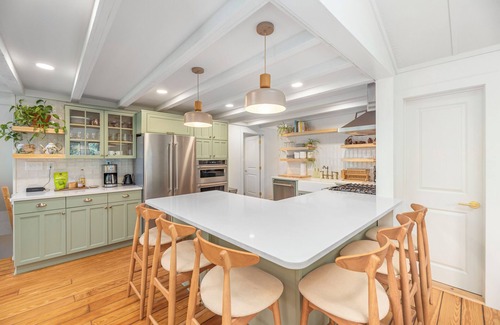 A stunning chef’s kitchen with a large island and double ovens, ideal for group cooking and gathering.