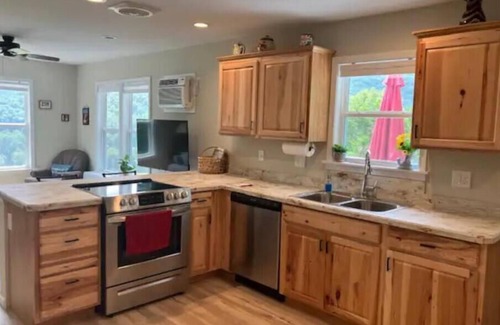 If you are coming to the mountains, why not stay IN the mountains? Enjoy the cool mountain air, breath-taking views, & peaceful surroundings. Away from it all, but close to town. This is a newly constructed, full-size, standalone one-bedroom apartment. Ideal for a couple, or family with 1 or 2 children. Roomy bedroom with king-sized bed & living room with sleeper sofa. Mountain views from all rooms & deck. Smart TV's, Wifi, private parking, fire pit, private fenced yard, pet friendly.
