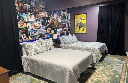 Step into the spotlight in this electrifying, cinema-inspired home filled with Hollywood glamour. Nestled in the heart of the city, this sleek home delivers a blockbuster experience. Enjoy watching your favorites on the 75" TV from the comfort of leather theater seats—perfect for binge-watching cult classics or the newest premiere.ind your favorite characters in the floor-to-ceiling murals throughout the home. Is your favorite movie among the 18 theater sized posters in the home? Enjoy comfort in each bedroom with mood lighting feeling like it was ripped from a steamy 80s thriller. Whether you're a lone anti-hero seeking a stylish escape or a crew plotting your next big adventure, this place delivers drama, luxury, and an unapologetic dose of cool. Book now and live your movie-star fantasy—because this isn’t just a stay, it’s a scene-stealer.