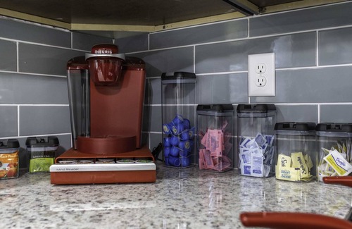 You have 2 main entrances into the home. As you walk into the front door you will see the complete open floor plan all the way to the back door. The living room with a very comfortable leather sectional, Blu-Ray player, 65 inch 4k Roku TV is first thing you see. Then you see the large 8 seat kitchen table and stunning kitchen stocked with over 50 individual supplies (pots, pans, baking sheets, cutting boards, wine bottle opener, glasses, children-ware, waffle maker, Keurig, coffee, cream, sugar, Ninja blender, toaster, kettle, tea and much, much more. In the back of the home is the washer, dryer along with iron/ironing board, laundry detergent and dryer sheets.