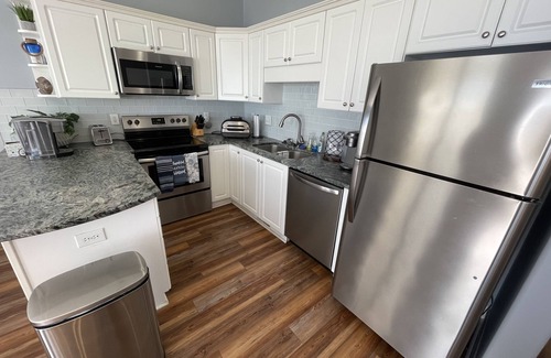 Accommodating up to 7 guests, this condo features three bedrooms: a luxurious queen bedroom with an ensuite bathroom, a comfortable queen bedroom, and a cozy double bedroom with a single trundle. Bedroom 3 also boasts a retractable stand-up office desk with a large monitor, perfect for remote work or video calls. Additionally, a ground-floor storage closet provides beach amenities for your convenience.
