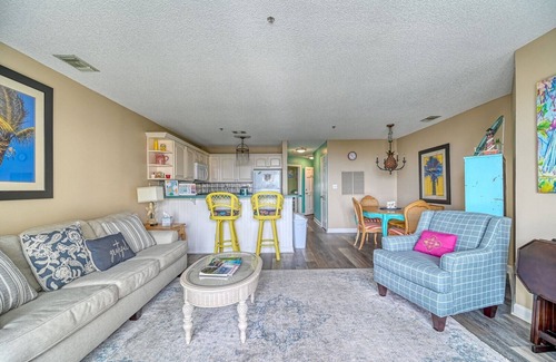 Playful and kitschy, with bright pops of aquamarine and sunny yellow throughout, Foreshore at Villa Capriani is the perfect water escape to have you feeling cheerful and friendly all week long. Comfy Beds, and a Primary Suite that sleeps a small family, with additional sofa bed in the living room make this condo the perfect beach vacation for two young families. Wind down from a day in the pools or gathering seashells, sea glass, and sharks teeth on the beach with a cocktail while you experience stunning ocean views from every window and balcony of you North Carolina beach Rental.