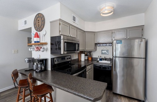 * Well-equipped kitchen; dishwasher; dining table, bar-top, and couch seating