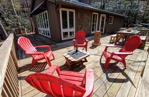 The spacious private deck is the perfect place to have a cup of coffee, read a book, or just sit and enjoy the sounds of nature. Roast a hot dog and some marshmallows over the outdoor fire pit. Spend your days playing and exploring the outdoors and your nights watching a movie next to the rustic wood burning fireplace. All the modern conveniences you need close by, but feels like you are far away from everything.