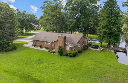 Escape to our serene river front retreat in New Bern. This short-term rental offers a river front dock, hot tub, master bedroom with a king bed, two full baths, a full kitchen, and sun room. Enjoy the convenience of additional golf cart rentals for transportation around the community and local golf course, deck, and dock perfect for relaxing outdoors. With its modern amenities and tranquil setting, this retreat is the ideal luxury stay. Boats, fishing poles, golf clubs, kayaks and pets all welcome!