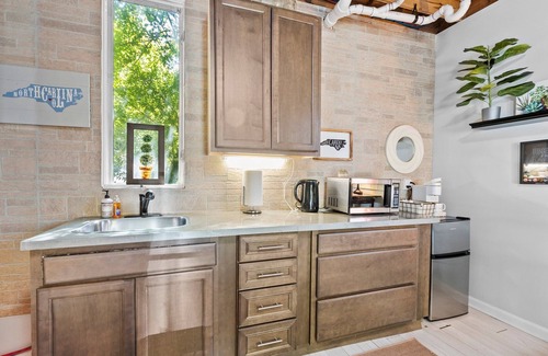 The space is a 500 sqft converted shed with an open-concept living room and kitchenette downstairs. Upstairs is a loft bedroom with a full bathroom. There is a lot of natural light, which is a space that lends itself to relaxing, working remotely, or getting ready for an event. G@@gle Fiber gig wifi will keep you connected during the workday and Netflix or Amazon Prime will help wind down at the end of the day.
