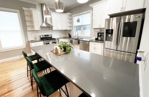 You'll be welcomed by a spacious front porch and into an open concept design that feels clean and grand. The living room has a large, comfortable sofa to Prep delicious meals in our fully-equipped kitchen and enjoy it in the dining area with a sleek design and dimmable lights to set the perfect mood. Finish the night in cozying up in our large sofa with complimentary streaming!