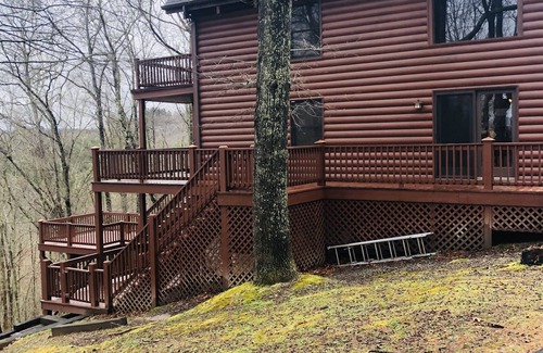 Beautifully Furnished 2201 sq. ft. cabin located in a gated community in Piney Creek, N.C! The cabin has 3 separate levels , Totally Furnished, main level has kitchen (fully Equipped) dining, and living room, With a stunning wood burning fireplace. Top floor is the master suite with breath taking views, King bed and Full Bath. Bottom floor has two private bedrooms with full Bath. Plus a ( Game Room,) fiber optic broadband Internet, TVs with Streaming services, air hockey, gaming console, and many more channels. Wrap around porches and private Balcony of the Master. The Cabin overlooks the New River. 25 minutes to downtown West Jefferson.. 55 minutes to Boone.. zip lines, snow tubing , skiing and much more! This home is at the top of a mountain on a well, Which means you must be conservative with water.