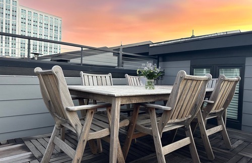 - Private rooftop terrace with fire pits, dining, mini fridge, grill, and incredible skyline and sunset views