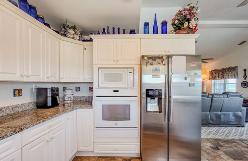 This beachy abode is not just about views; it’s designed for comfort and accessibility, featuring a convenient handicap ramp that wraps around the house and connects to the main level deck. The expansive master suite is a true sanctuary, complete with a luxurious en-suite bathroom that boasts a whirlpool tub—the perfect spot to unwind after a day of beach fun.
