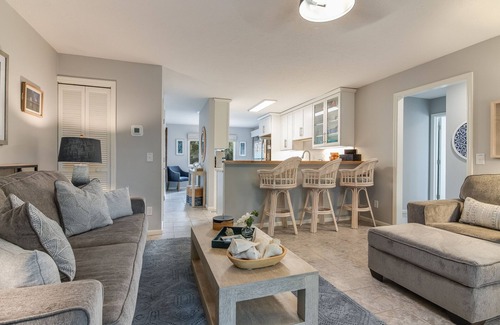 “Always Ride The Wave” is a newly decorated, newly furnished two bedroom / two bath condo located in Royal James with its own private community pool, outdoor shower and BBQ area. The beautifully remodeled kitchen is completely stocked for all your cooking desires. The master suite contains a King size bed with a private bathroom that includes a tub/shower combo. The 2nd bedroom has a queen bed with a bath containing a tub / shower combo. This condo has an in unit laundry closet plus both bedrooms have TV's in them. A pull out couch is in the living room for extra guests. There are two updated furnished balconies both accessible from each bedroom or main living area. The back balcony has a golf course view with ambient lighting while the front one looks over the pool. They are perfect for outdoor dining, your morning coffee or your afternoon beverage We also include a brand new 4 passenger golf cart for your Island cruising, wifi, 4 bikes and a temporary lifestyle membership to the BHI Club and Shoals. The memberships are an additional fee purchased directly through the clubs.