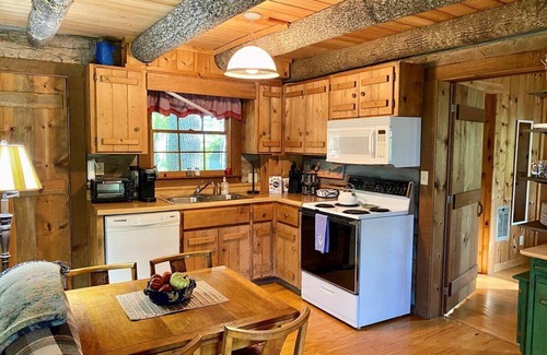 When you walk through the threshold into the main level, you are greeted by the living area with a stone wood burning fireplace, smart TV equipped with YouTube TV, open kitchen, and dining area. The kitchen is equipped with basic kitchen supplies you might need.