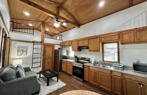 Enjoy the best of tiny home living in this new custom-built home. Lots of amenities are packed into this small space including comfortable seating, a large fully stocked eat-in kitchen, full-size bath, spacious bedroom, and washer and dryer. It has 16ft ceilings in the living area and two lofts for extra storage.