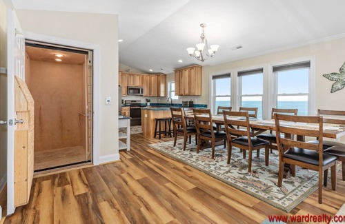 You and your family can relax and unwind in this wonderful North Topsail Beach home located on the oceanfront in the Village of Stump Sound! You will have everything you need and then some to make memories at the beach with all the amenities you need including 5 bedrooms, 3.5 baths, elevator, community pool and more! The top floor of the home is the main living area - step inside to the open floor plan where a beautiful living room awaits with stellar views and access to an oceanfront covered porch with direct beach access. This porch is a great place to spend any time of day or night as the views are spectacular! You'll enjoy movie nights on one of the two large flat screen TV's as well as wonderful conversation. The spacious and modern kitchen features vibrant solid-surface countertops, stainless steel appliances and everything you need to prepare delicious meals. The dining table seats 10 plus 4 more at the kitchen peninsula.
