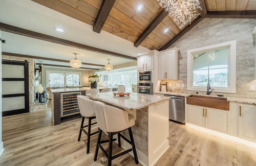 The fully equipped kitchen has high-end appliances, including a glass-door refrigerator, gas stove, and barn doors to the walk-in pantry. There is seating for 7 at one of the two kitchen islands - one island features a wine fridge and ice maker. Make an adult beverage and keep the group's chef company while meals are being prepared.