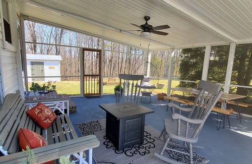 Located on a quiet county road, this home is full of farmhouse charm. The house is approximately 1600 square feet. The B's Nest was completely renovated in 2021, this home has a master ensuite on the main floor with the perk of a huge closet/vanity space. The kitchen comes fully stocked with all the essentials needed to be a master chef or grill expert. Custom millwork throughout lends to the charm of the home. The cozy living area has gas logs to keep you extra warm. The open stair case from the dining room leads to a bonus space upstairs and two more bedrooms. All upstairs rooms have dedicated desk/vanity space. Rock, swing or glide into tranquil comfort on the screened porch. On cool nights snuggle up by the gas firepit table.