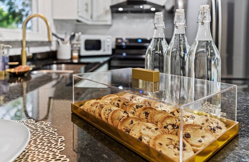 A coffee bar with Keurig, coffeemaker, water, and chocolate chip cookies awaits you on the counter!